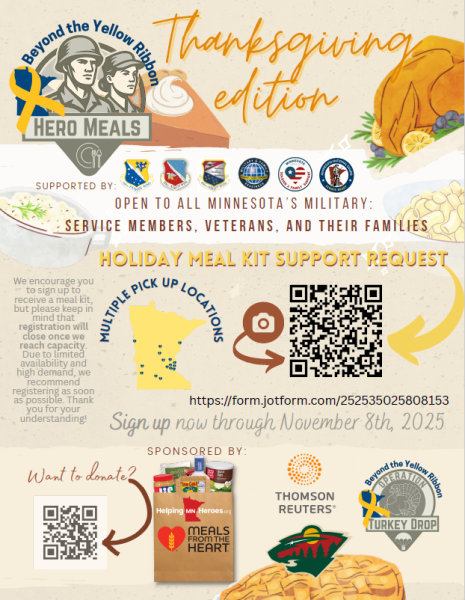 Beyond the Yellow Ribbon has a Holiday Meal Kit program available to all of Minnesota’s military service members, veterans and their families. It’s called “Hero Meals”. If you are in need to some help this holiday season, simply sign up by scanning the QR code below on the left. If you would like to donate to this program and help provide even more kits, scan the QR code on the right. There are multiple pickup locations throughout the state. Supplies are limited so registration when supplies are gone! Sign up now through November 8th! See the flyer below for more details.